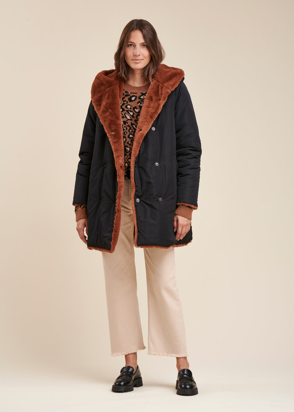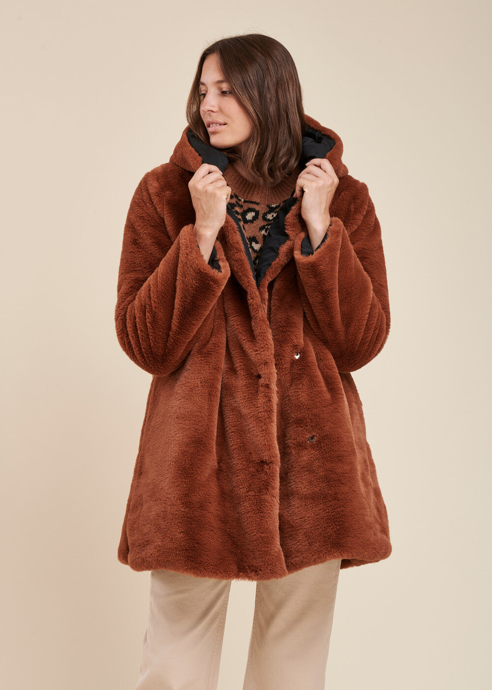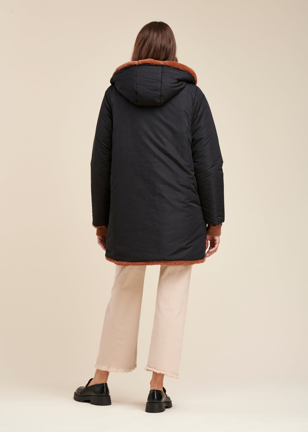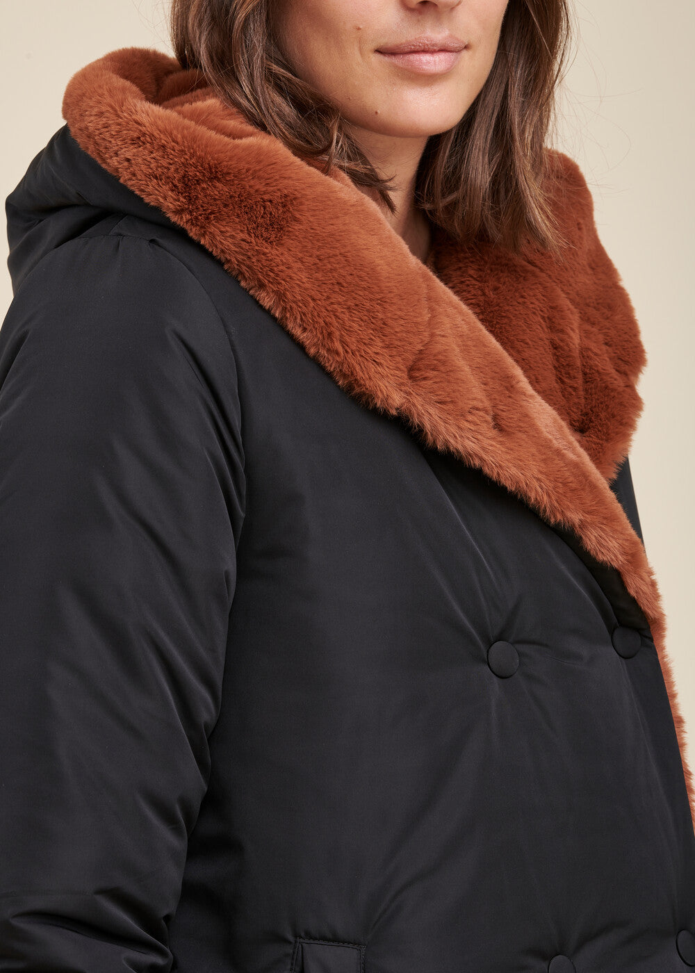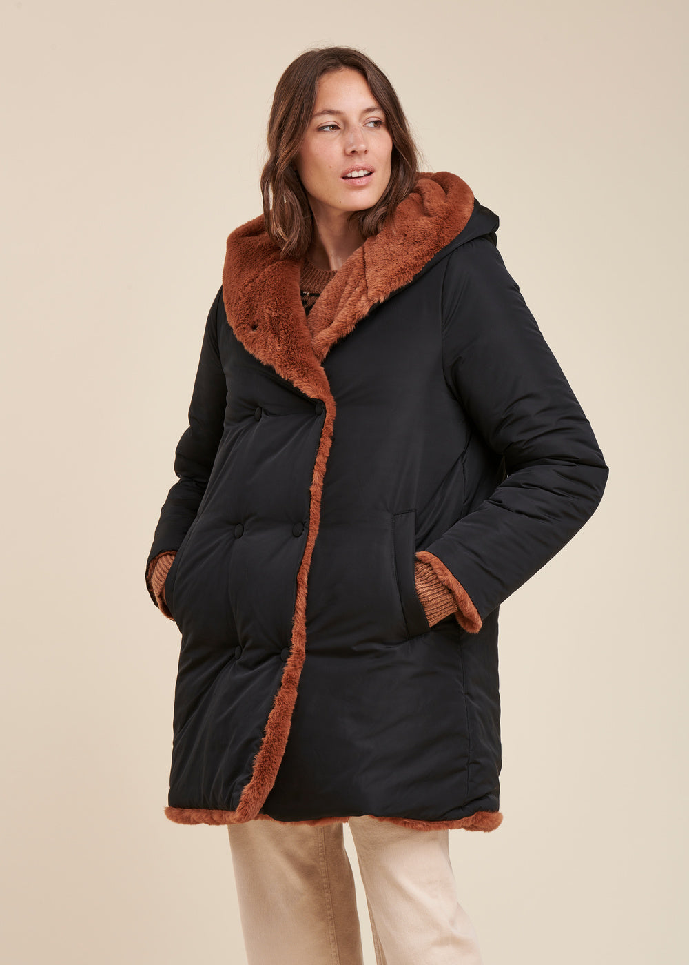Doudoune mi-longue réversible avec un côté tissu technique lisse, l’autre tout doux effet fourrure. Fermeture par un double boutonnage de pressions discrets, 2 poches sur le côté et capuche enveloppante. Ce modèle est en polyester recyclé, labelisé RCS EGL/252903. Longueur : 88 cm.