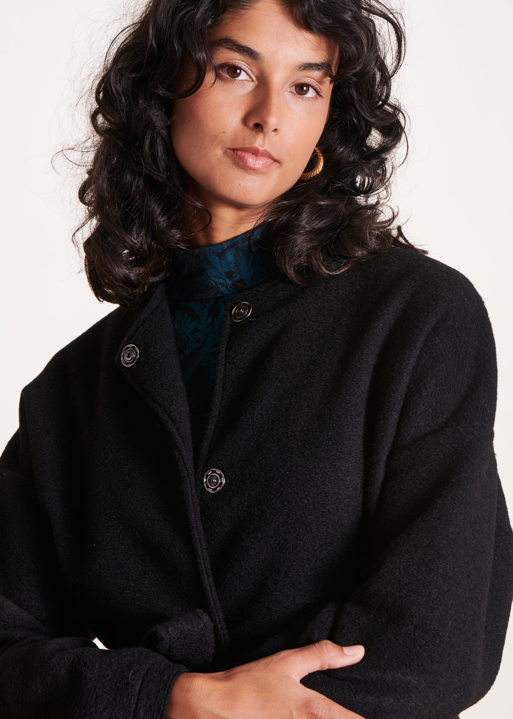 Manteau court noir ceinturé en laine