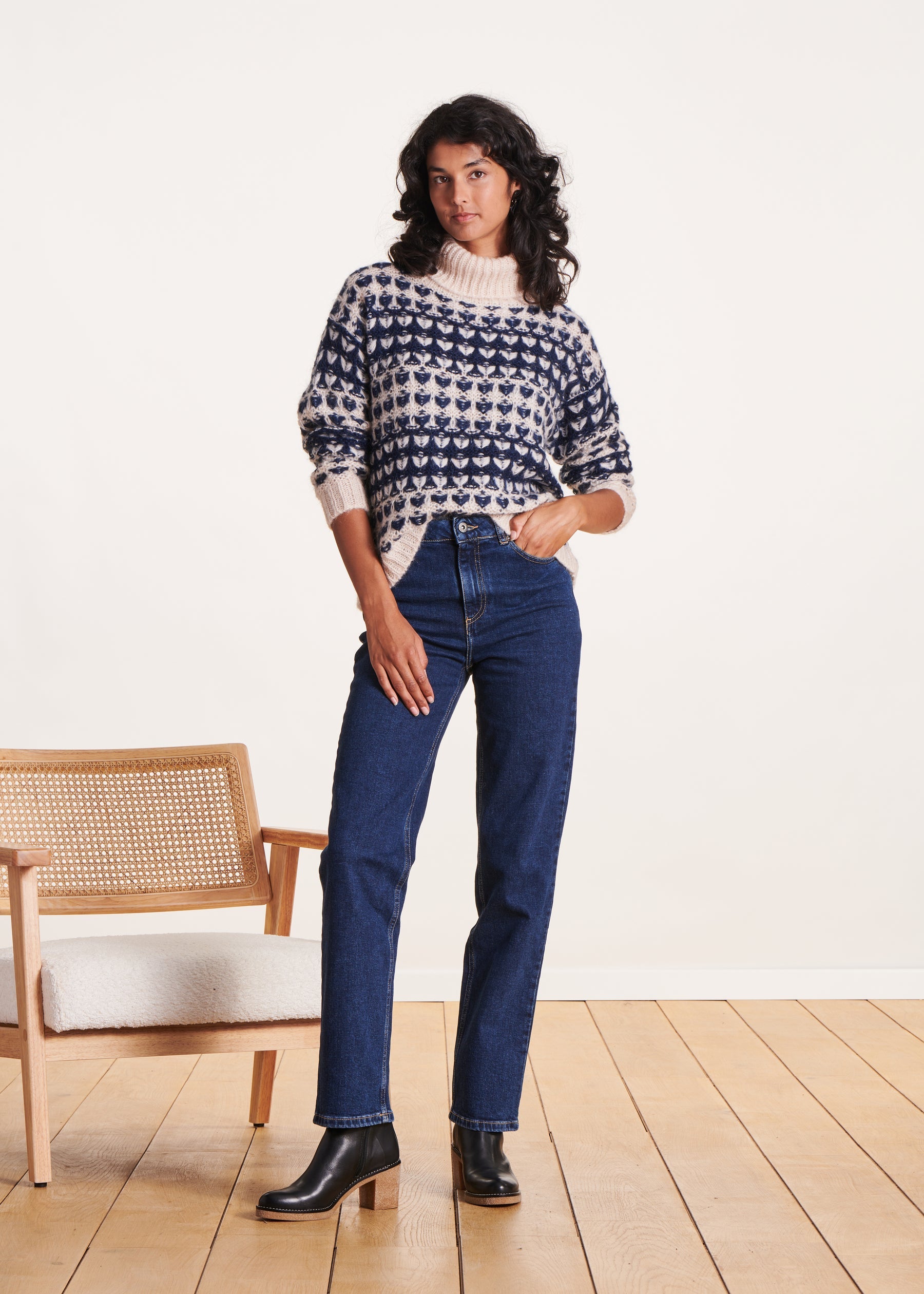 Pull bleu en jacquard à col roulé