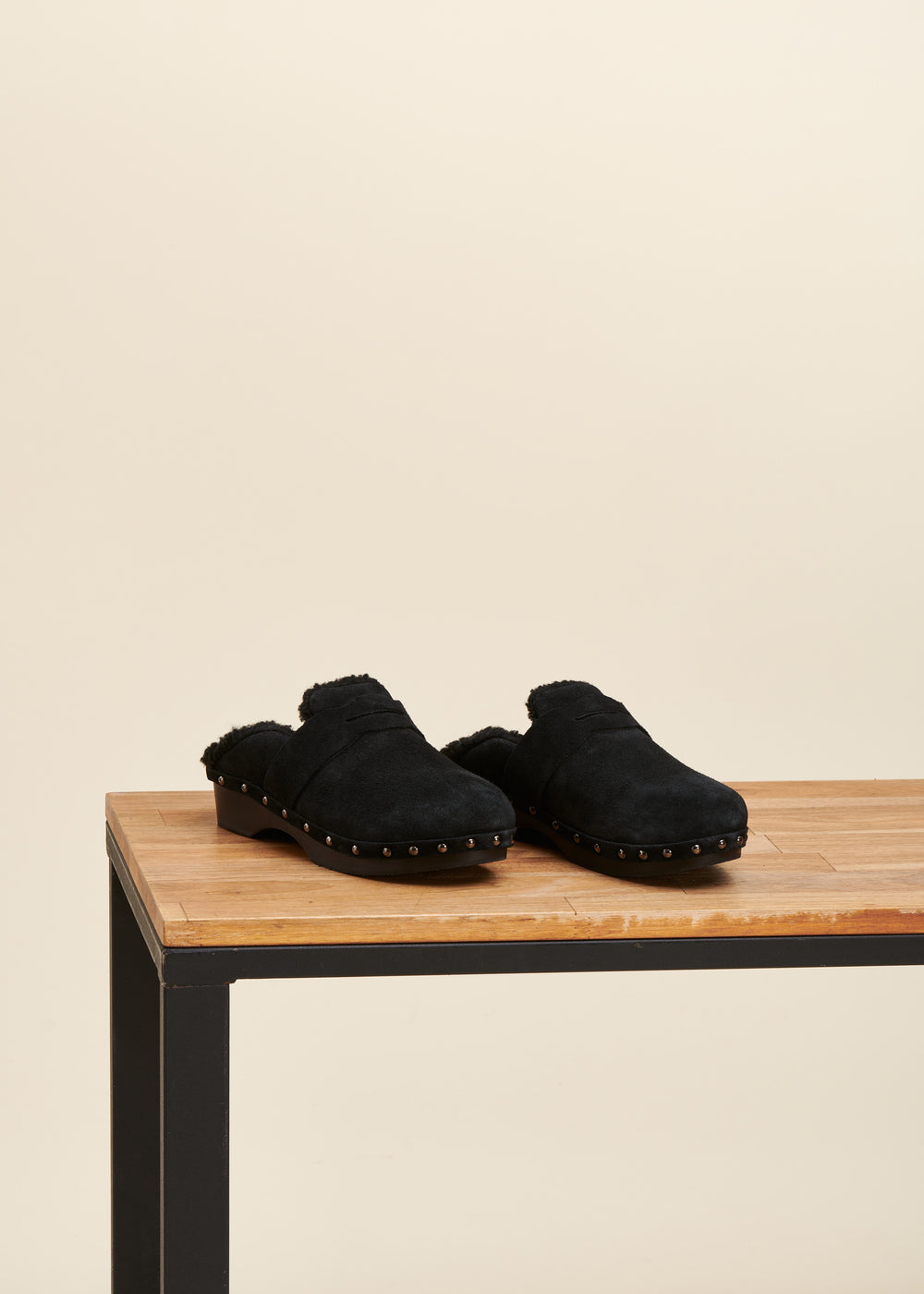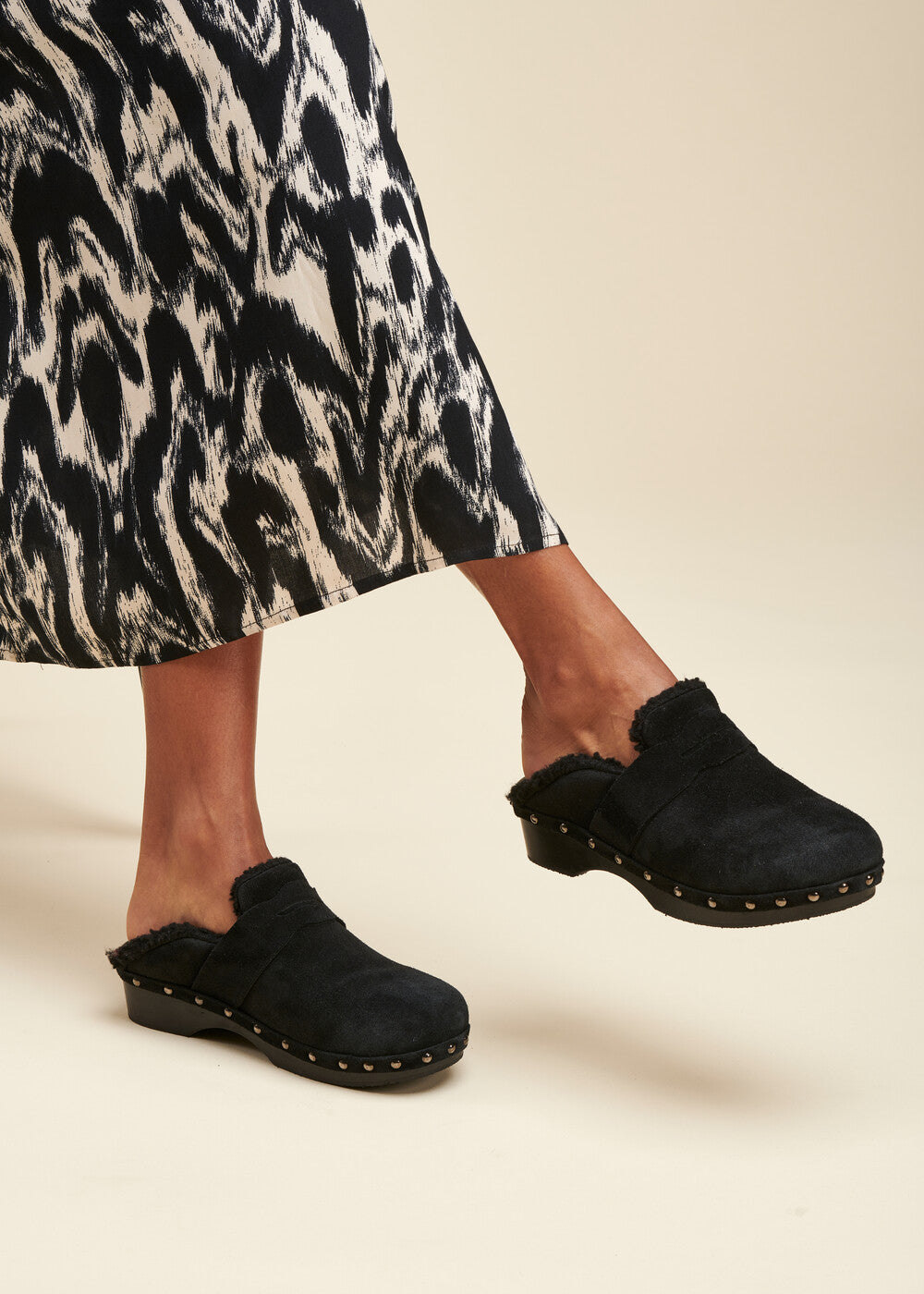 Sabots en croûte de cuir, intérieur moumoute, semelle extérieure en bois, fabriquées au Portugal. Talon : 6 cm.